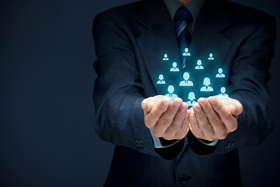 Protecting gesture of businessman or personnel and icons representing group of people.